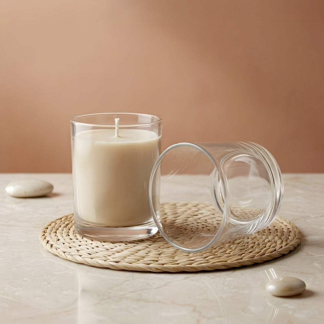 Le verre transparent est un classique intemporel. Il valorise la couleur naturelle de la cire et permet de jouer avec des inclusions décoratives comme des fleurs séchées, des paillettes ou des colorants. C’est le choix idéal pour les créateurs qui souhaitent mettre en avant leur créativité. Ce type de contenant s’intègre facilement dans tous les styles d’intérieur, du plus moderne au plus traditionnel, tout en offrant une ambiance lumineuse et élégante. Veillez à ce que le verre de votre contenant soit suffisamment épais pour résister à la chaleur de la cire chaude.